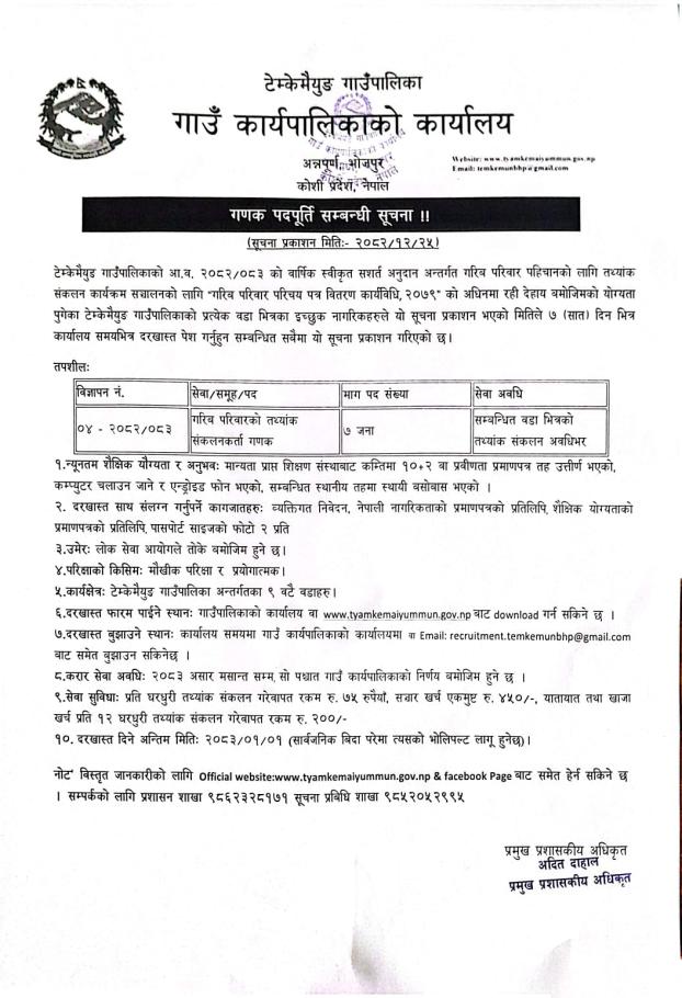 गरिब परिवार पहिचान लागि तथ्याङ्क संकलनकर्ता गणक पदपूर्ति सम्बन्धी सूचना