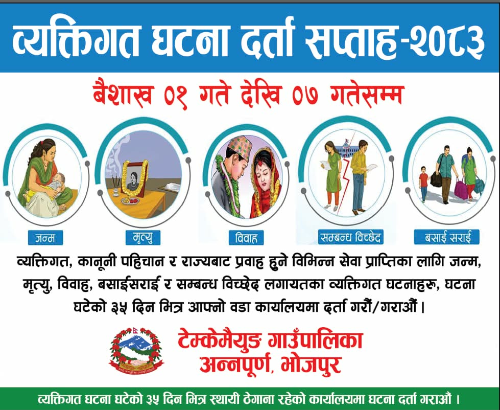 जन्म, मृत्यु, विवाह, बसाइँसराइ तथा सम्बन्ध विच्छेदजस्ता व्यक्तिगत घटनाहरू घटना भएको ३५ दिनभित्र वडा कार्यालयमा दर्ता गराऔँ।