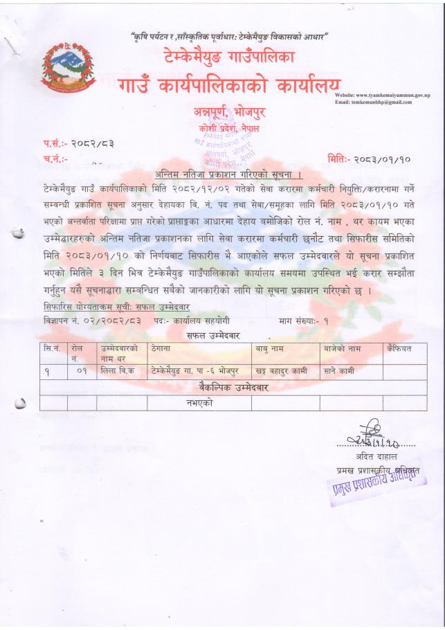 कार्यालय सहयोगी पदको अन्तिम नतिजा प्रकाशन गरिएको सूचना