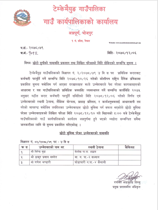 छोटो सुचिको नामवली प्रकाशन तथा लिखित परिक्षाको मिति तोकिएको सम्बन्धि सुचना