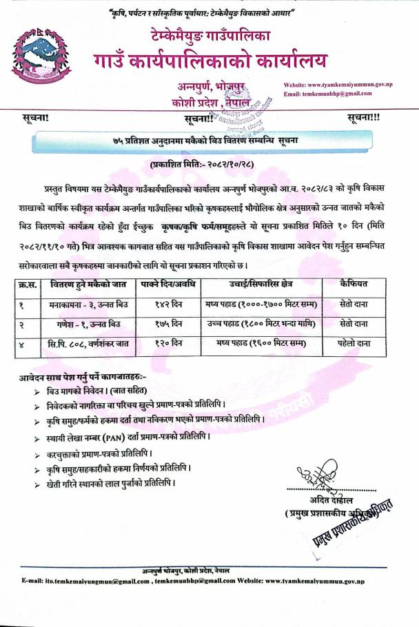 ७५% अनुदानमा मकैकाे बीउ वितरण सम्बन्धि सूचना ।