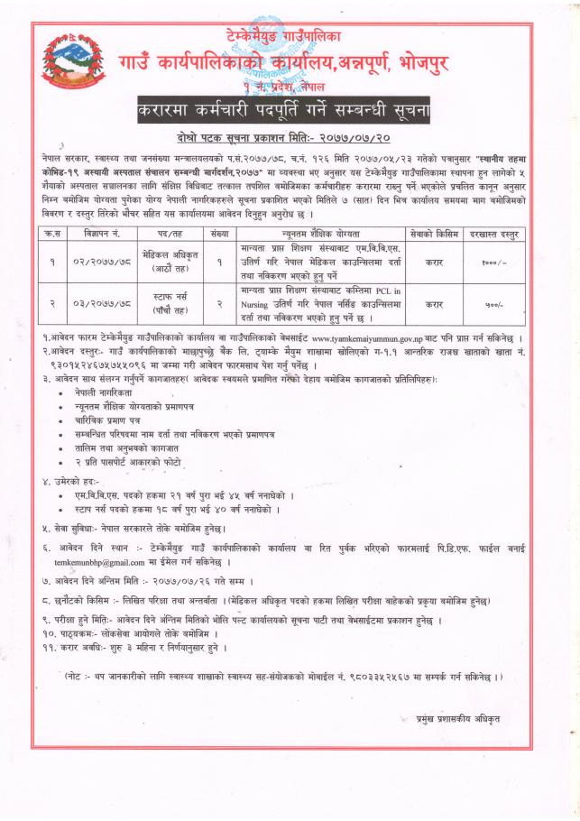 नेपाल सरकार स्वास्थ्य तथा जनसंख्या मन्त्रालयको पत्रानुसार स्थानीय तहमा कोभिड -१९ अस्थायी अस्पताल संचालन सम्बन्धी मार्गदर्शन २०७७ बमोजिम यस गाउँपालिकामा संचालन हुन लागेको ५ शैयाको अस्पतालको लागि संक्षिप्त विधिबाट करारमा कर्मचारी पदपूर्ति सम्बन्धी दोश्रो पटकको  सूचना। साथमा दरखास्त फारम समेत संलग्न गरिएको छ।